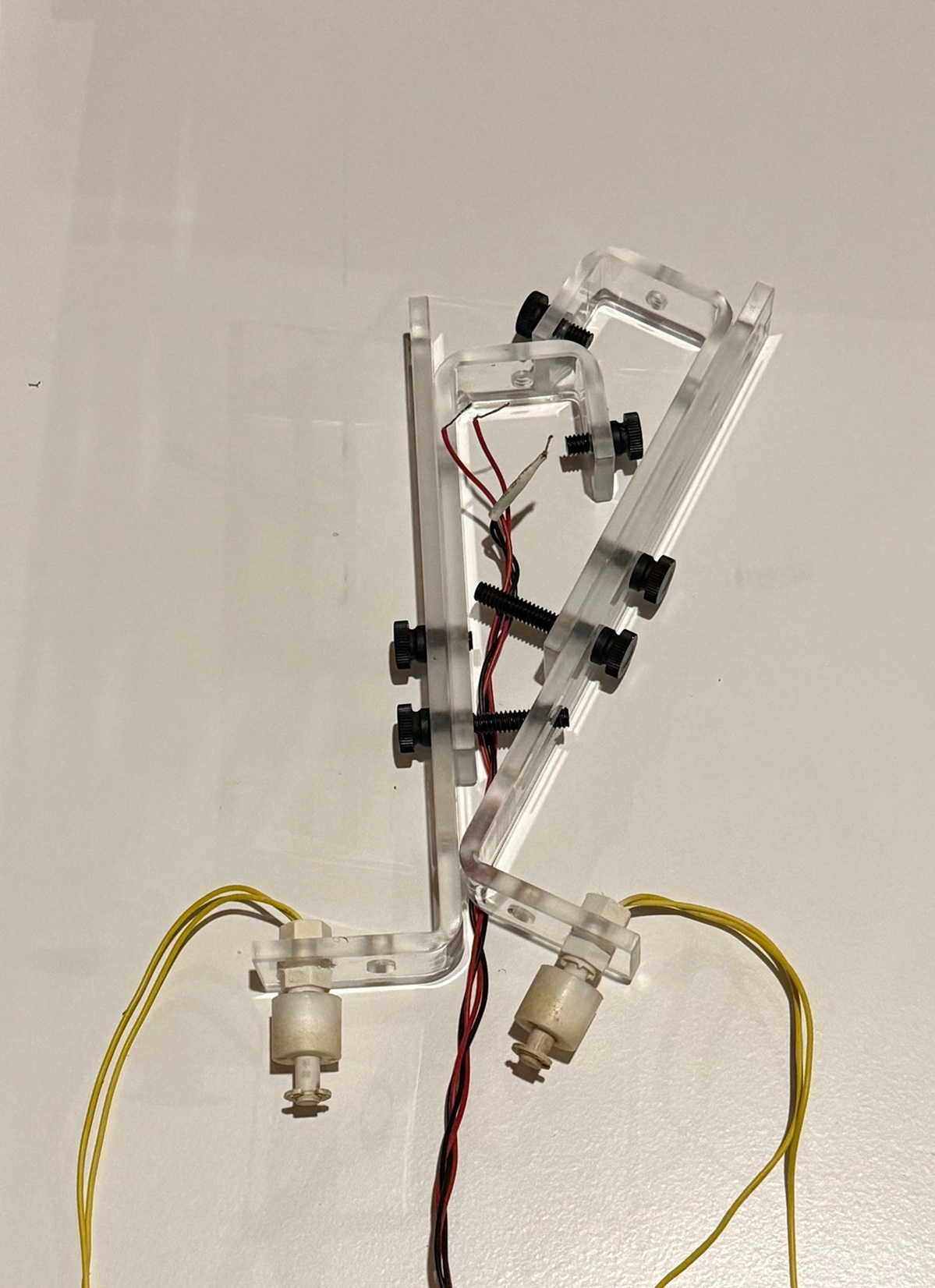 One used pair of float switches with mounting brackets suitable for use with Apex breakout box or other controller in controlling water level in the sump.