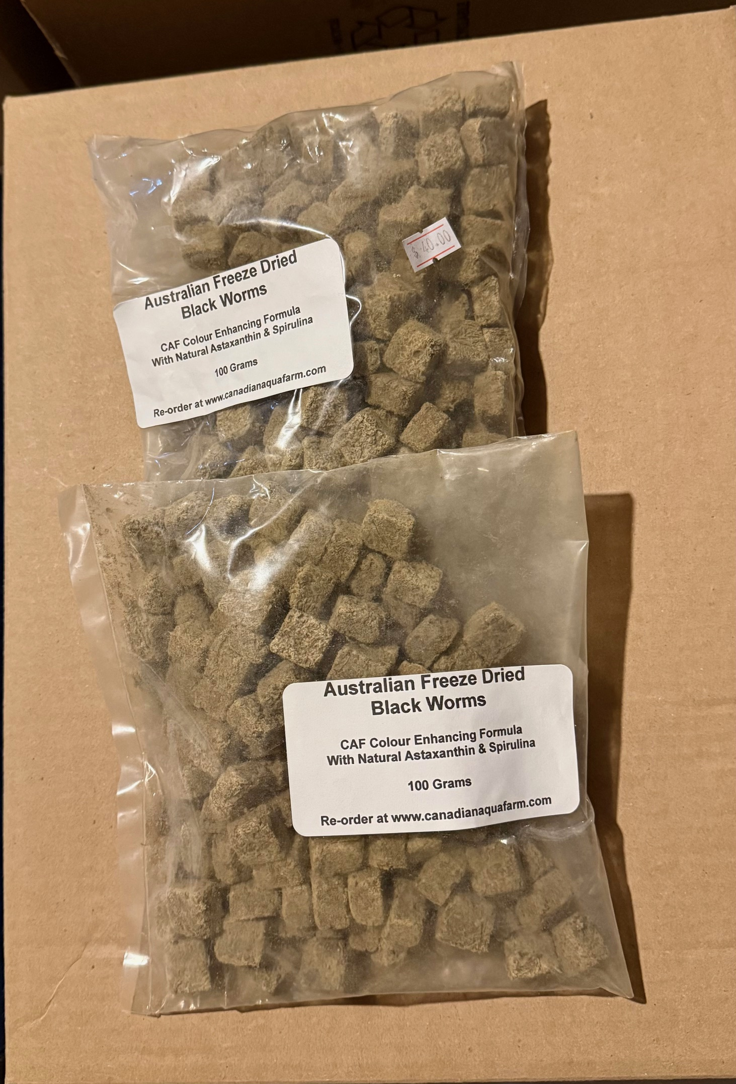 One unopened Bag of CAF Colour Enhancing Formula Australian Freeze Dried Black Worm Cubes, and one opened Bag but with 80 g left CAF Colour Enhancing Formula Australian Freeze Dried Black Worm Cubes.