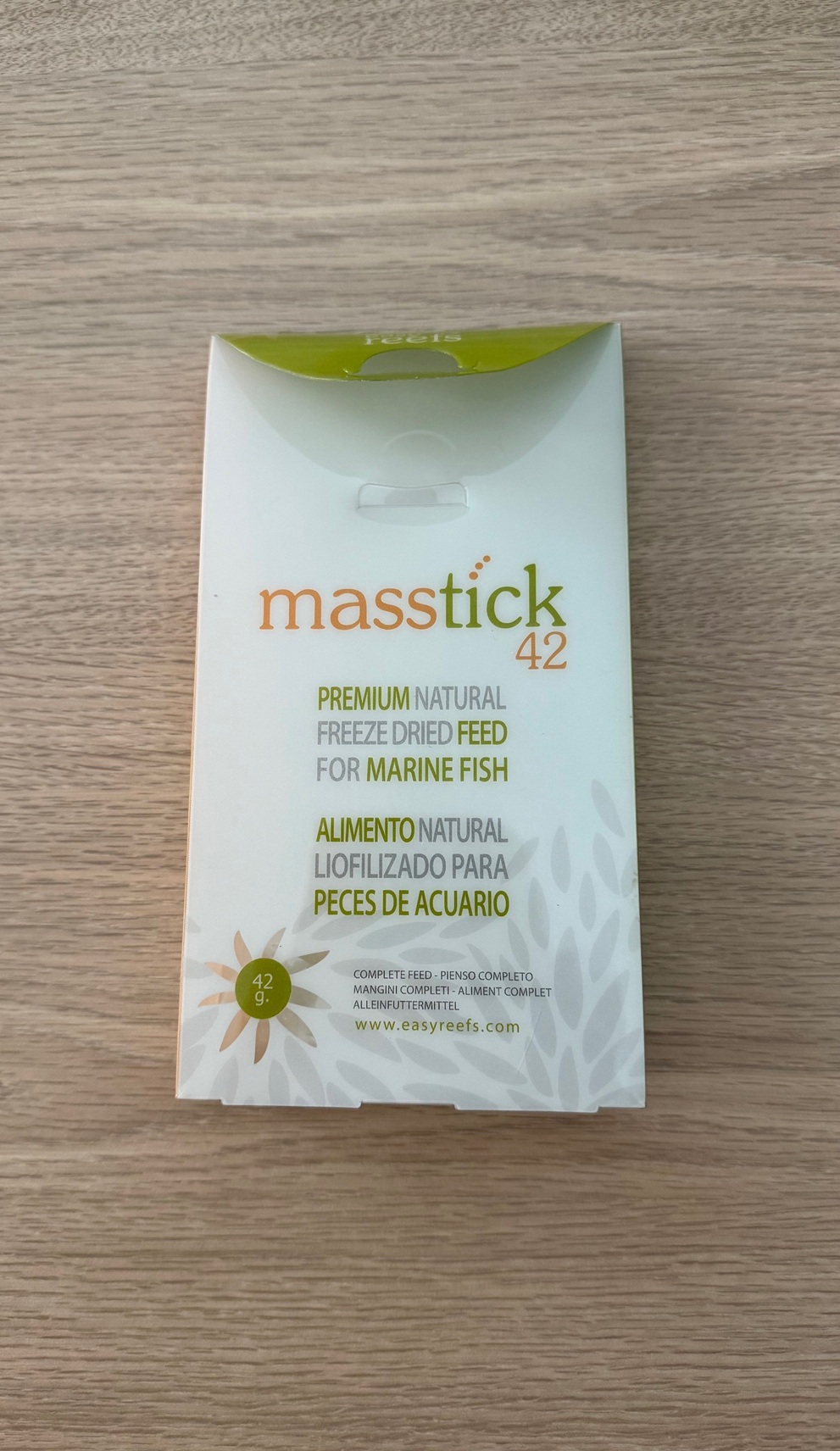 Masstick is a rehydratable powder that becomes a self adhesive paste food for omnivorous marine fish and marine invertebrates. Once prepared it can be pressed onto rocks coral skeletons or aquarium glass so fish can graze naturally for hours without the food dispersing through the water.