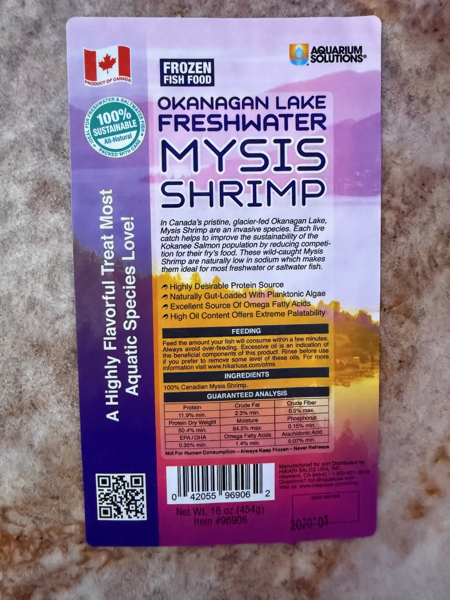 New and Unopened Okanagan Lake Freshwater Mysis Shrimps Frozen Flat 16 oz.