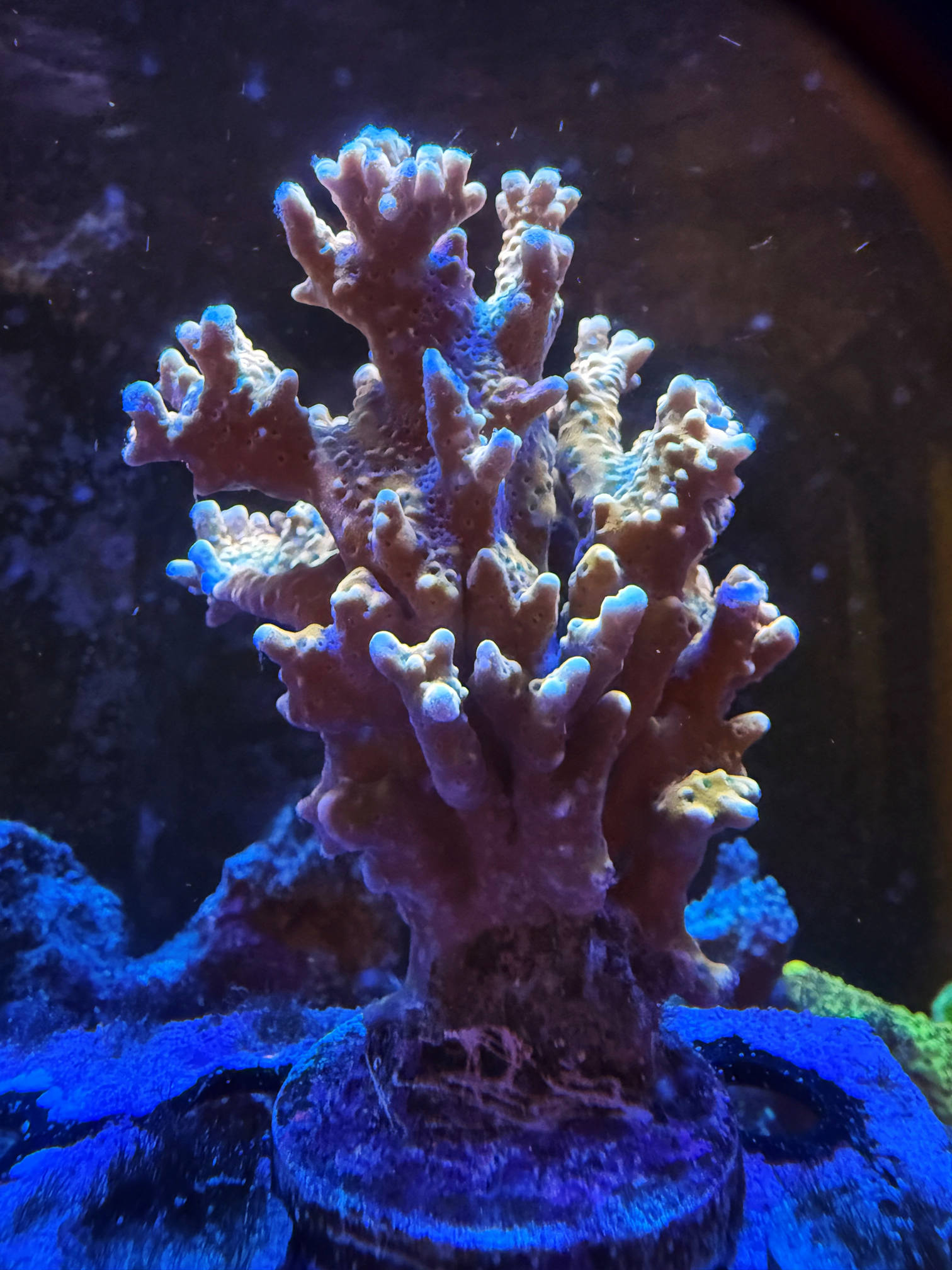 Return to shopDescription: 3.5″ x 4″ Reef Raft Tropicana Anacropora Colony.